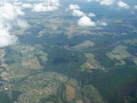 Pohled na vysílač Cukrák nedaleko Prahy. V přední části je vidět obec Černošice s řekou Berounkou, v pozadí Vrané nad Vltavou