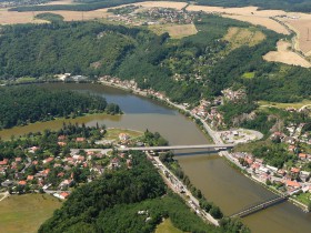 Soutok Sázavy (s typicky kalnou vodou) a Vltavy v Davli. Most vpravo dole posloužil v roce 1968 filmařům pro natáčení slavného snímku "Most u Remagenu"